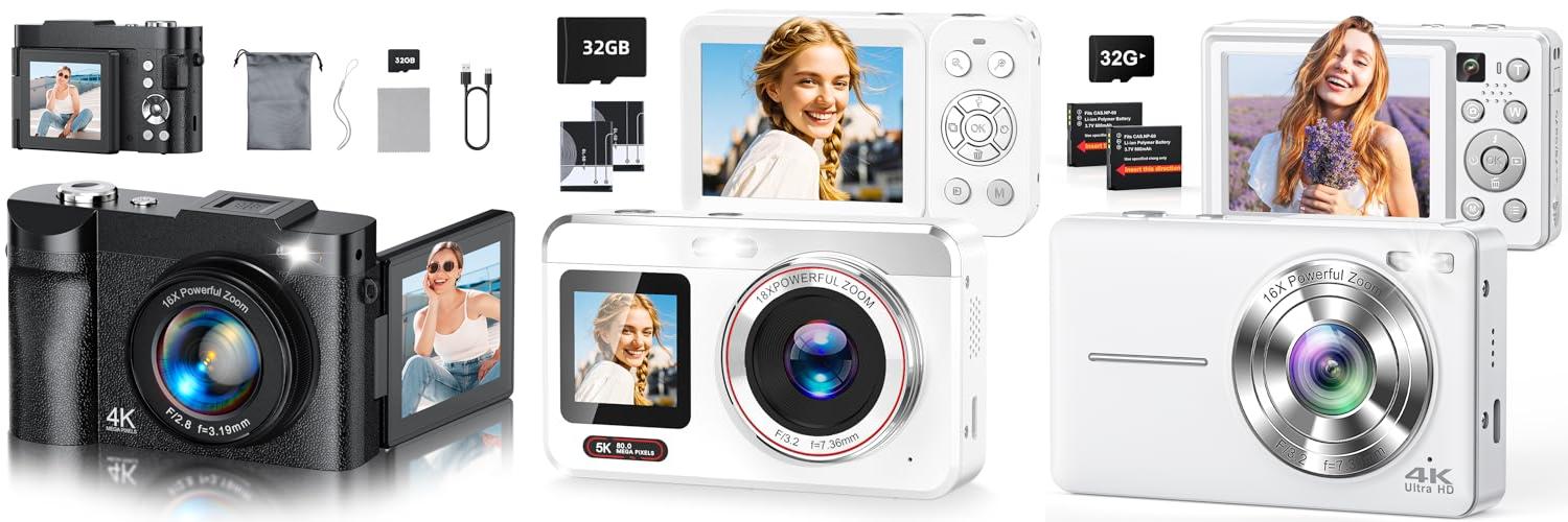 Digital Camera, 4K 64MP Cameras for Photography, Point and Shoot Digital Camera with Auto Focus, Dual Camera, Flash, 16X Zoom, Anti Shake, 32GB Card, Compact Vlogging Camera for Teens, Adults
