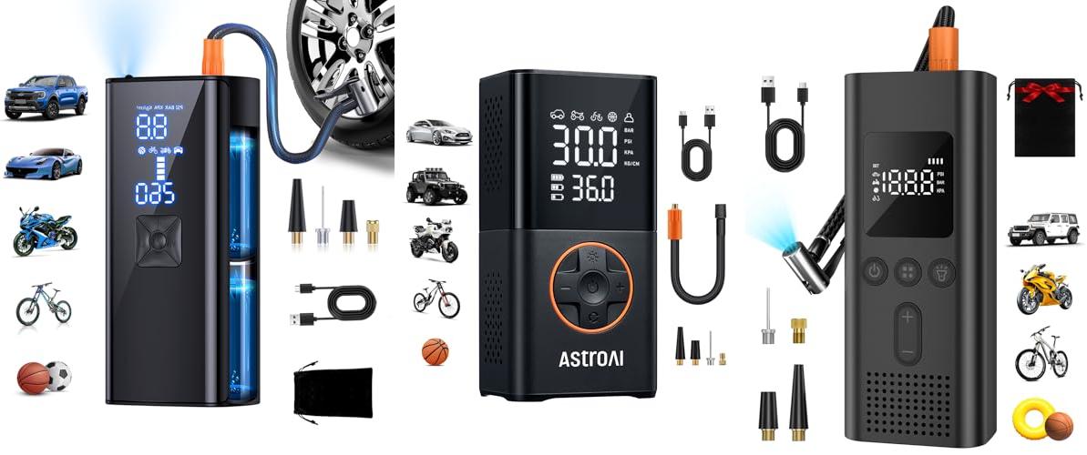 The AstroAI L7 Tire Inflator Portable Air Compressor is a compact and powerful cordless mini bike pump. It features a digital dual value display, 150 PSI capacity, and LED lights, making it a versatile tool for inflating car tires, motorcycles, bikes, and balls. Its advanced TrueGauge screen provides accurate pressure readings, helping you drive safely.